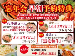 11月20日までに12月のご予約をいただいたお客様には飲み放題時間延長・お鍋のお肉が「黒毛和牛」にグレードアップなど、各種早割特典をご用意しております♪少人数様から団体様まで忘年会は「北海道」におまかせください♪